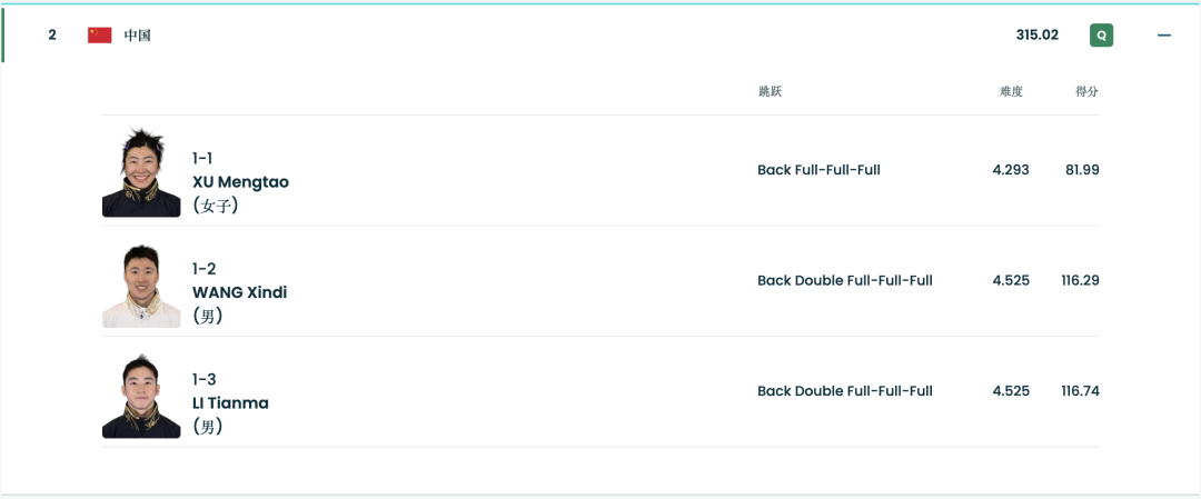 两跳过后,中国队总分暂列第三位。最后一跳,小将李天马登场,同样高质量完成了“Back Double Full-Full-Full”动作,拿到了116.74分,从而帮助中国队以总分315.02分反超澳大利亚来到第二,作为四个成绩最好的队伍挺进第二轮决赛。